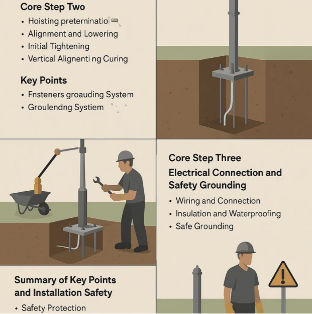 • Vertido y curado de hormigón: Vierta concreto del grado de resistencia requerido y proteja los pernos durante el curado para evitar impactos y contaminación. El tiempo de curado del concreto debe cumplir con los requisitos de diseño (generalmente de 7 a 14 días) antes de que se pueda izar el poste de luz.