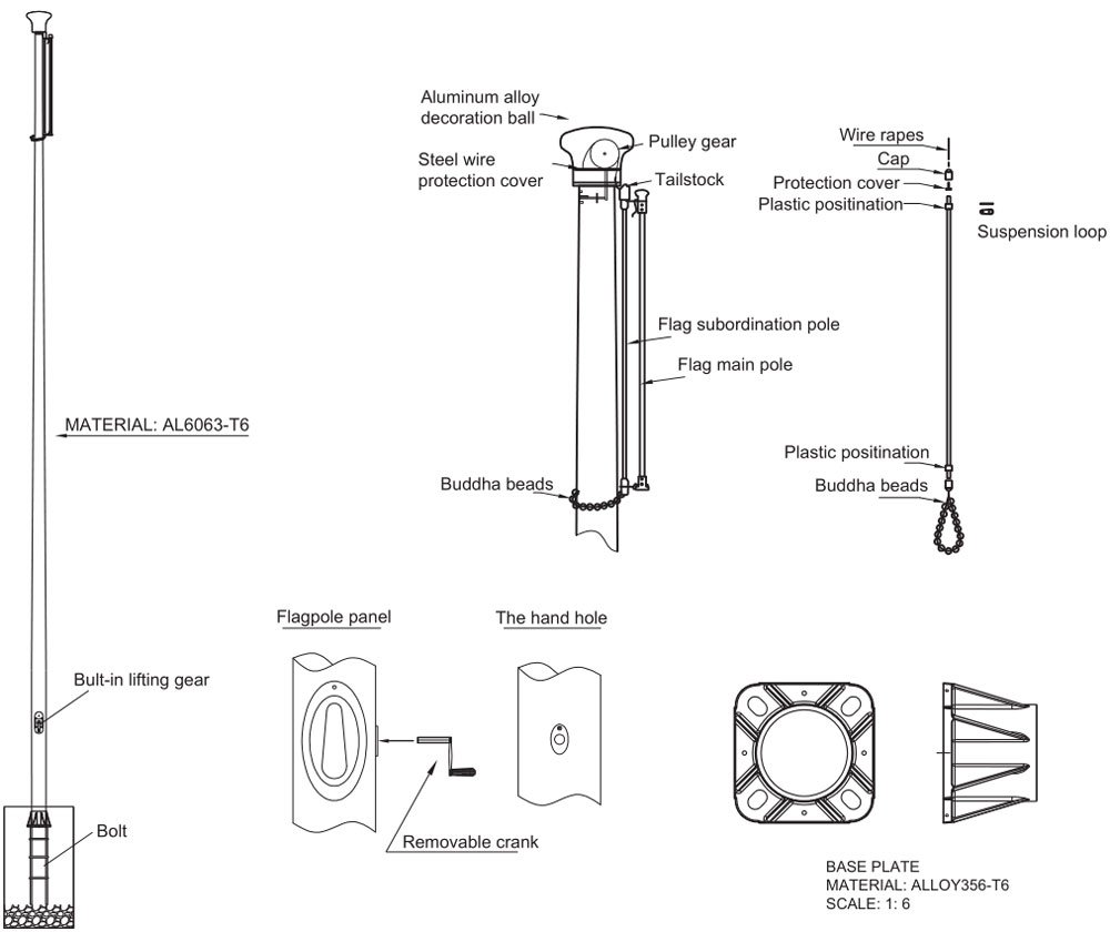 | NO. | Altura (m) | tubo inferior (mm) | Tubo superior (mm) | Tubo interior (mm) | Diámetro superior (mm) | Diámetro inferior (mm) | Placa base (mm) | Placa incrustada (mm) | Tamaño del perno (mm) | Diámetro del orificio de montaje (mm) | ||